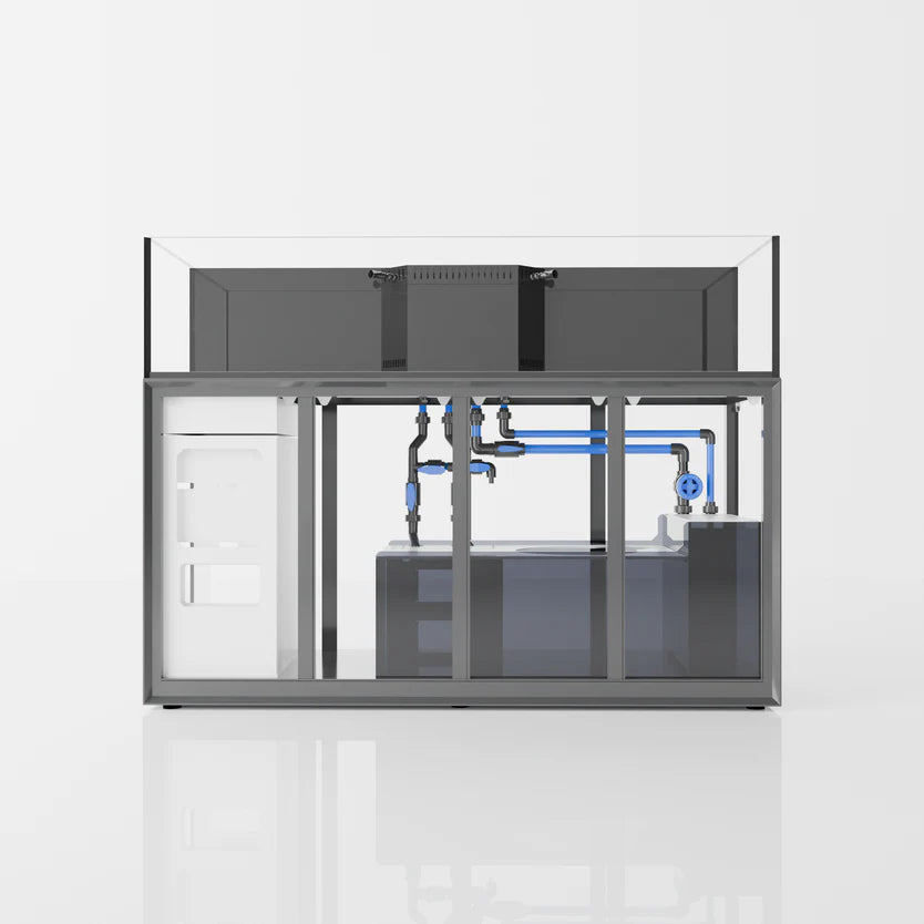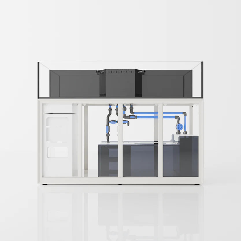 The integrated sump system provides comprehensive features. Gate valves ensure smooth water flow while minimizing noise, while additional ball valves and barbed fittings cater to external equipment needs such as reactors or chillers. To reduce salt creep, a gasket is placed below the drain pipe and sump. The multi-chamber design includes a prefilter baffle to capture larger solids, reducing sock replacement frequency. Diffuser plates are incorporated to minimize noise and floating. The second chamber is specially designed to accommodate a variety of popular protein skimmers and respective water level requirements. The third chamber can be customized with desired media or used as a refugium.