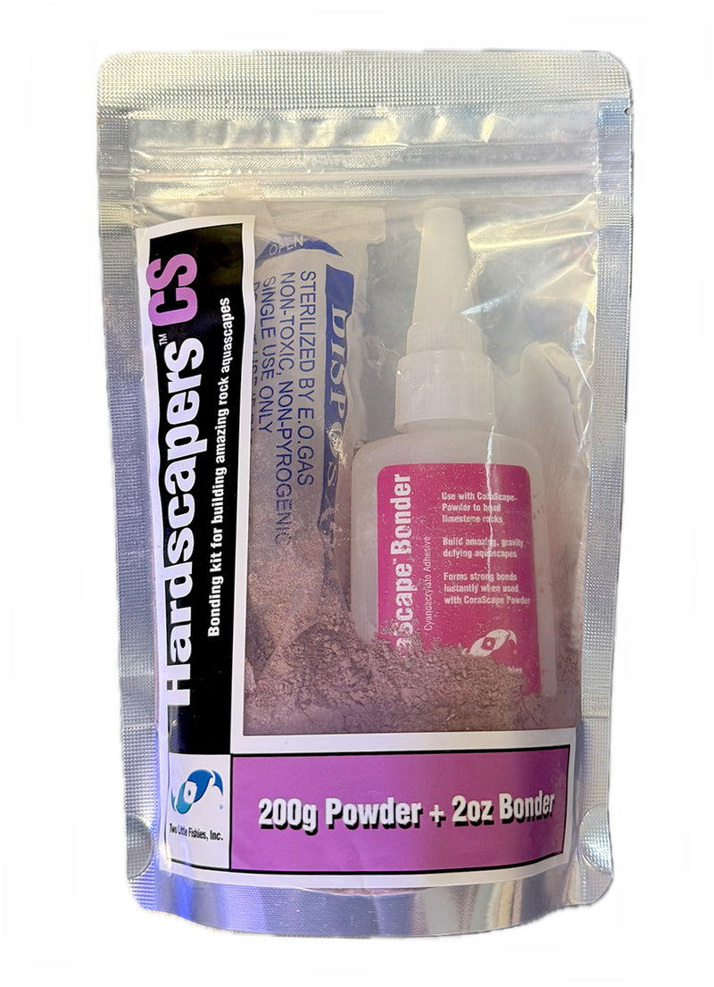 Hardscapers CS is a two-part kit that contains 2oz. of CoraScape Bonder Cyanoacrylate and 200 grams our CoraScaper Powder made from pulverized coralline-colored oolitic limestone. Also included is a curved-tip irrigation syringe to facilitate the application of the bonder. Aquarium hobbyists can use Hardscapers WS to bond dry rocks and quickly and easily form strong, solid, gravity-defying, amazing aquascapes with coralline colored limestone rocks.