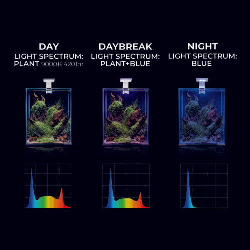 The DAY / DAYBREAK / NIGHT light modes can be changed manually or remotely via the Aquael app-controlled Socket Link Duo controller, which is also available from Aquael.